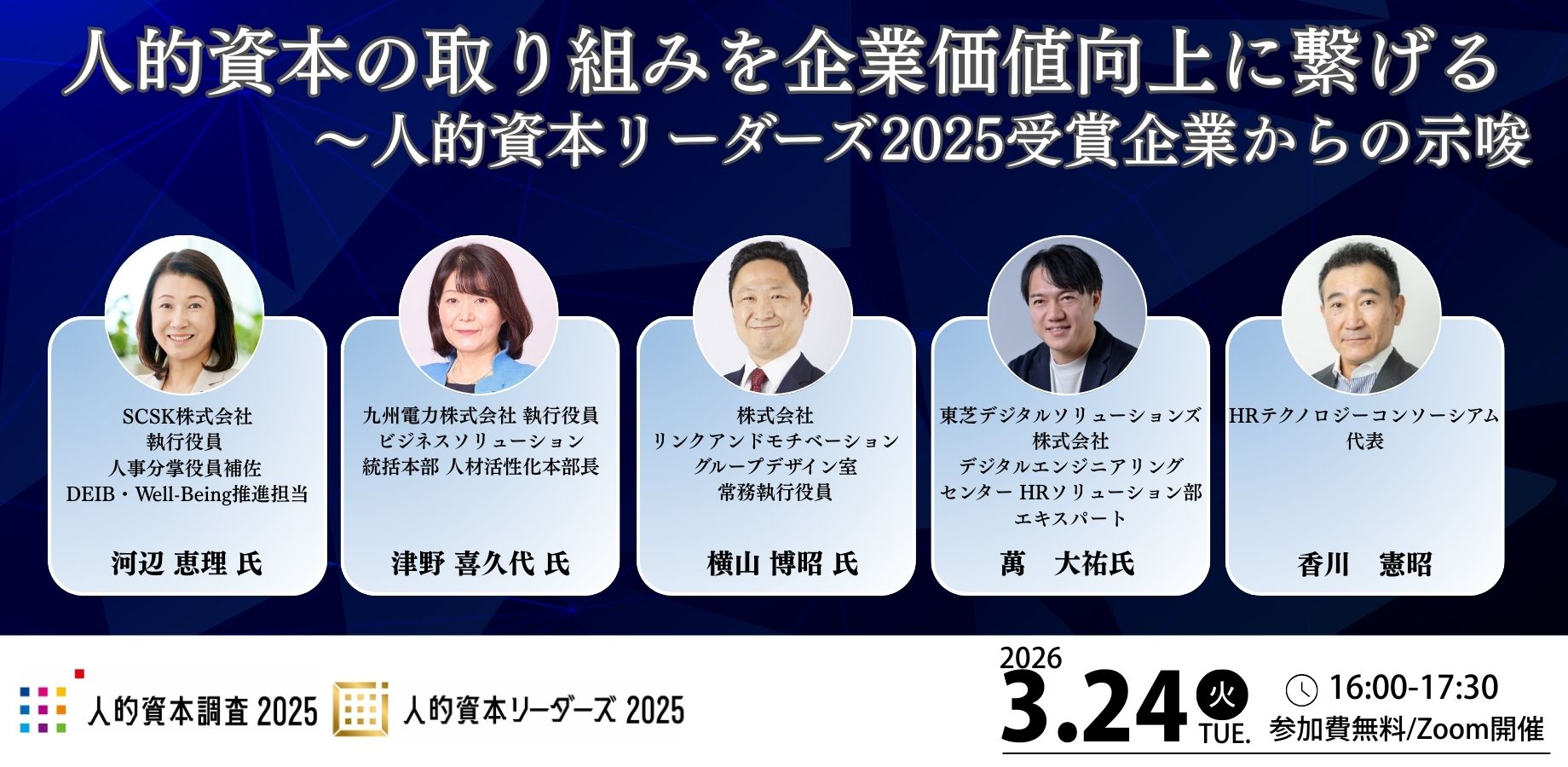 イベント・セミナー 参加申込者受付中 人的資本の取り組みを企業価値向上に繋げる 〜人的資本リーダーズ2025受賞企業からの示唆 開催日: 2026年03月24日 (火) 16:00 申込期間: 2026年02月27日 (金) 〜 2026年03月22日 (日) #人材開発 #組織開発 #経営戦略