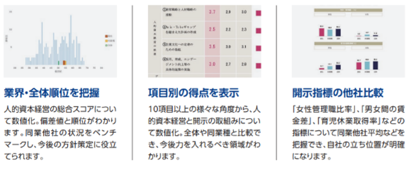 自社の人的資本取組状況を簡易診断したフィードバックレポートを無償でご提供します。自社の課題把握や今後のさらなる推進に向けてご活用いただけます。